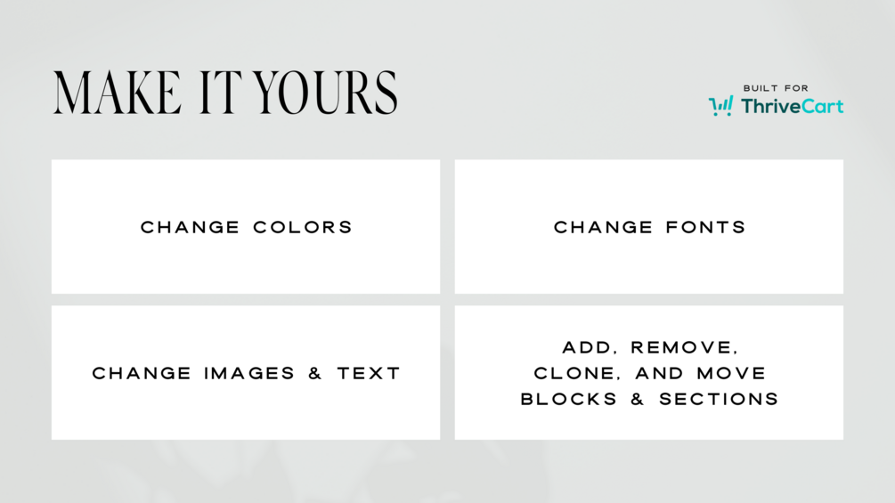 - Instant access to your ThriveCart template including the long-form sales page, success page, and offer bump design