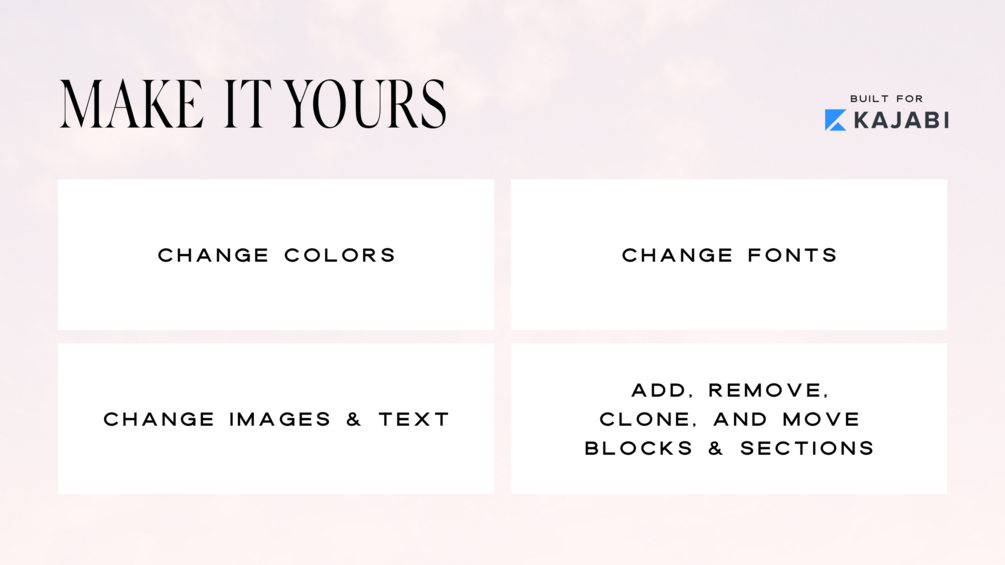Your purchase include usage rights for one Kajabi account – either yours or a client's. You can not share or resell these templates, or use a single license for multiple client projects.