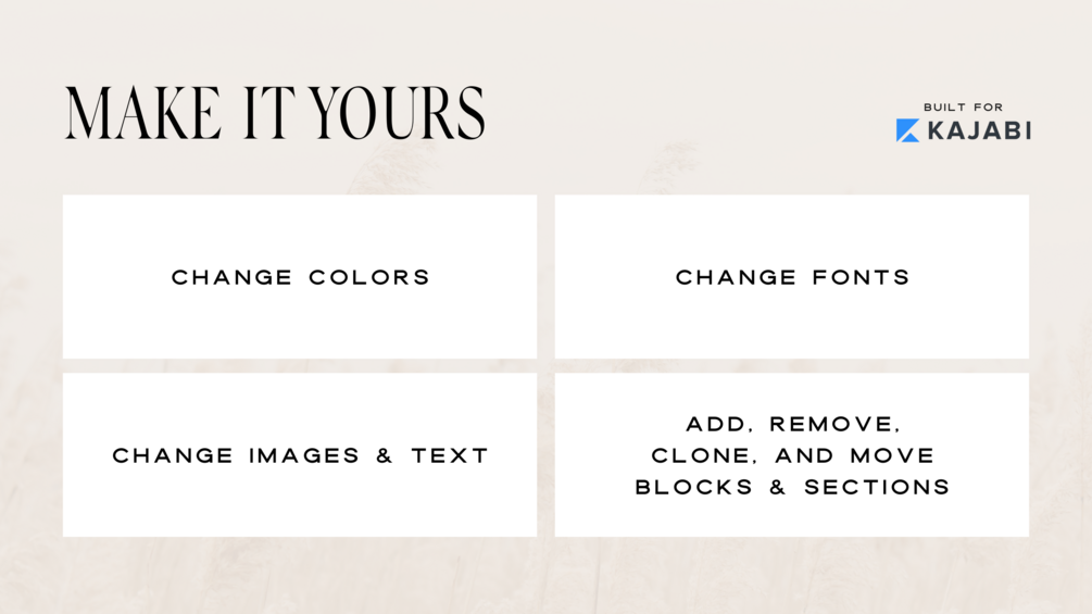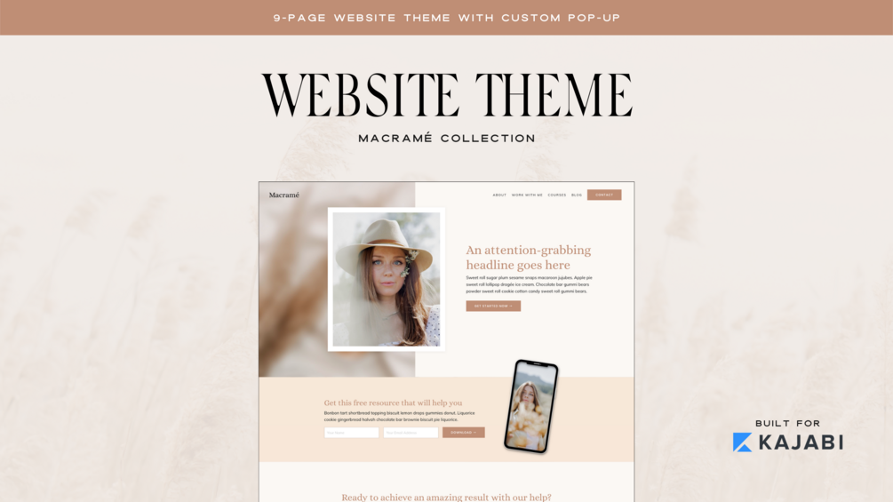 - Instant access to all the Kajabi website theme, including 9 pages and custom exit pop-up